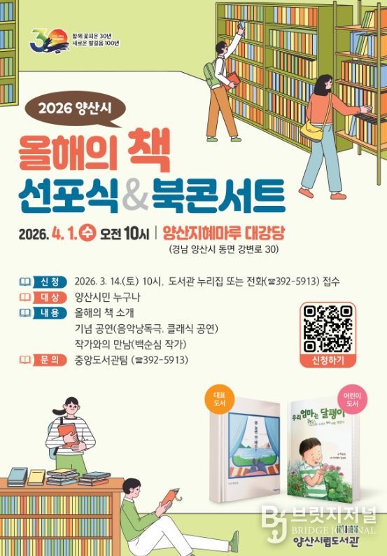 브릿지저널 김경미 기자 | 양산시립도서관은 오는 4월 1일 수요일 오전 10시, 지혜마루 대강당에서‘2026년 올해의 책 선포식 및 북콘서트’를 개최한다.