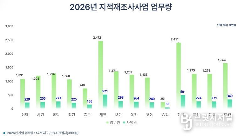 올해 충북도는 47개 지구 1만8,497필지를 대상으로 총 39억 원을 투입해 지적재조사사업을 추진하고 있으며, 토지 경계 정비와 디지털 지적 구축을 통해 토지 이용 효율성을 높이고 도민 재산권 보호에 기여할 것으로 기대된다.