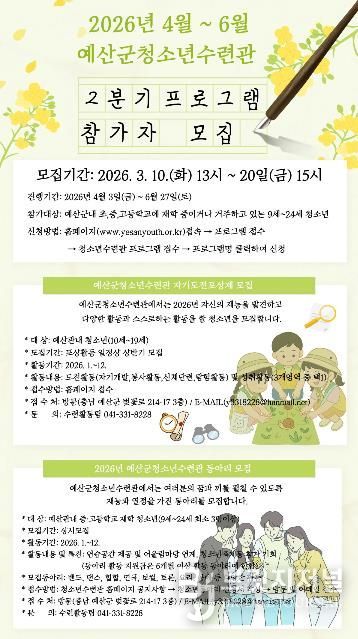 브릿지저널 정보영 기자 | 예산군청소년복지재단 소속 예산군청소년수련관은 관내 청소년의 건강한 성장 지원과 자기주도적 역량 강화를 위해 2026년 2분기 청소년 프로그램 참가자를 모집한다고 밝혔다.