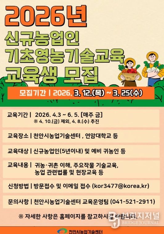 브릿지저널 정보영 기자 | 천안시농업기술센터는 오는 25일까지 ‘상반기 신규농업인 기초영농기술교육’ 참여자를 모집한다고 13일 밝혔다.
