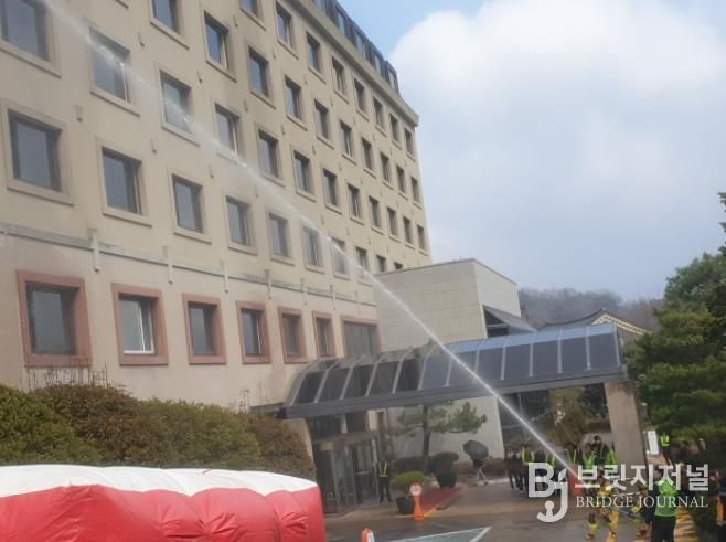 브릿지저널 정보영 기자 | 울진소방서는 지난 12일 LG생활연수원을 대상으로 고층건축물 화재대응 및 전기자동차 화재진압 훈련을 실시했다.