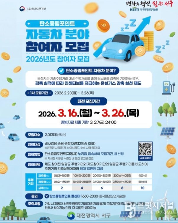 브릿지저널 정보영 기자 | 대전 서구는 온실가스 감축을 위해 3월 16일부터 26일까지 2026년 자동차 탄소중립포인트제 참여자를 모집한다고 13일 밝혔다.