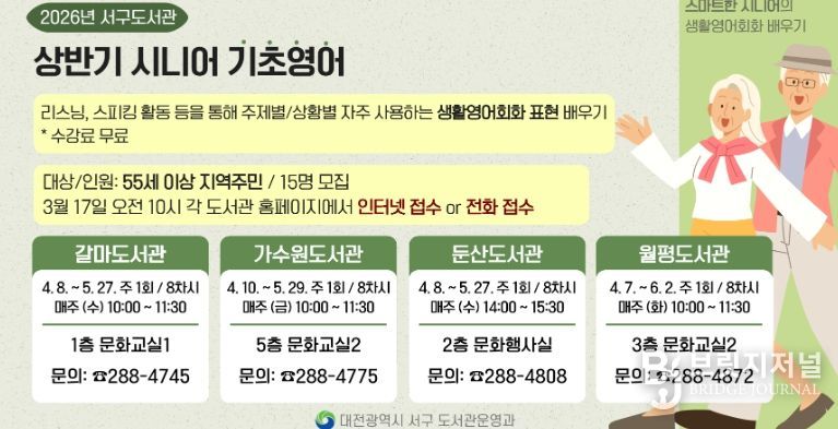 브릿지저널 정보영 기자 | 대전 서구 4개 도서관(갈마·가수원·둔산·월평도서관)은 55세 이상 지역 주민을 대상으로 2026년 ‘상반기 시니어 기초영어’ 강좌를 운영한다.