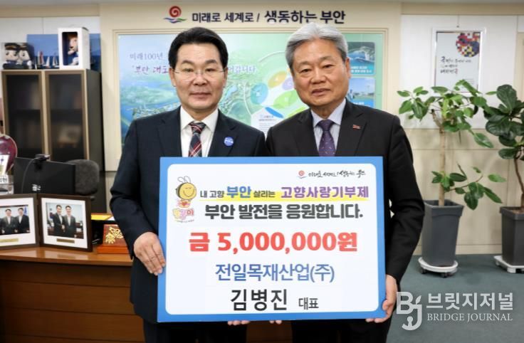 브릿지저널 윤나영 기자 | 부안군은 지난 12일 김제시에 소재한 전일목재산업㈜‧㈜전일우드텍 김병진 대표가 부안군 고향사랑기부금 500만원을 기탁했다고 밝혔다.