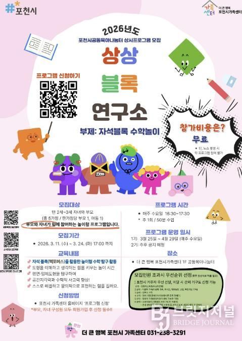 더 큰 행복 포천시가족센터장(겸임 가족여성과장 최선희)은 “아이들이 놀이를 통해 자연스럽게 사고력과 창의력을 기를 수 있도록 다양한 체험형 프로그램을 지속적으로 운영할 계획”이라며 “앞으로도 공동육아나눔터를 중심으로 부모와 아이가 함께 성장할 수 있는 가족 친화 프로그램을 확대해 나가겠다”고 밝혔다.