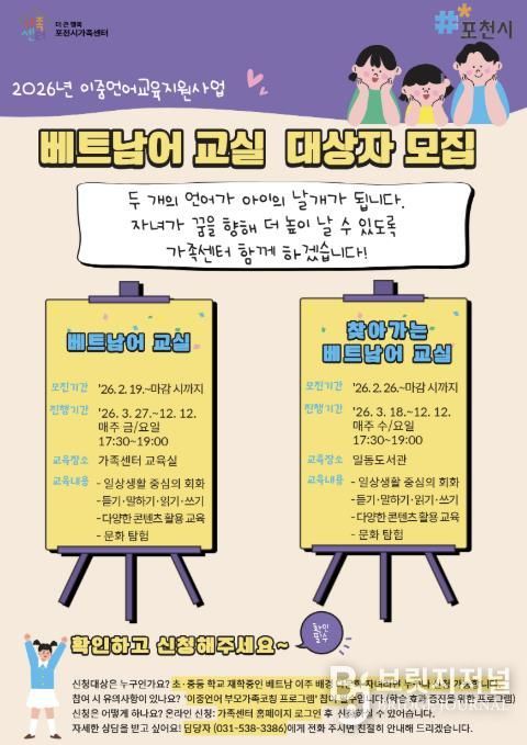 브릿지저널 김경미 기자 | 포천시 직영 ‘더 큰 행복 포천시가족센터’는 다문화 자녀의 이중언어 역량 강화를 위한 2026년 이중언어 교육지원사업 베트남 교실 수강생을 모집한다.