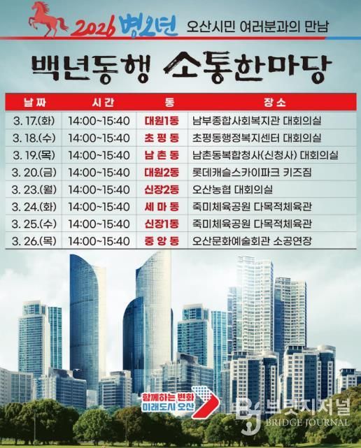 브릿지저널 김경미 기자 | 오산시가 시민과 직접 만나 시정 운영 방향을 공유하고 지역 현안을 듣는 ‘2026 백년동행 소통한마당’을 개최한다.