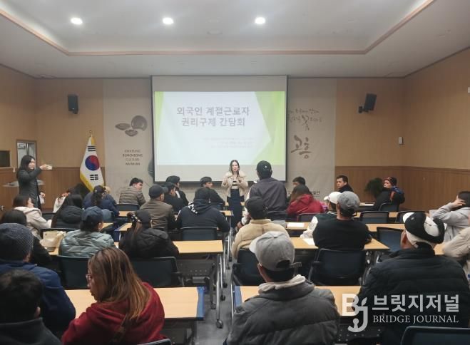 브릿지저널 김경미 기자 | 고흥군은 지난 12일 고흥분청문화박물관 강당에서 관내 외국인 계절근로자의 인권 보호와 실질적인 권리구제를 위해 ‘외국인 계절근로자 권리구제 간담회’를 개최했다고 밝혔다.