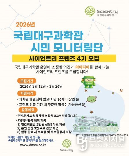 이번 국립대구과학관 사이언트리 프렌즈 4기 모집은 3월 12일부터 3월 26일까지 진행되며, 대구·경북 지역 대학생 및 시민을 대상으로 15명 내외로 선발할 예정이다.