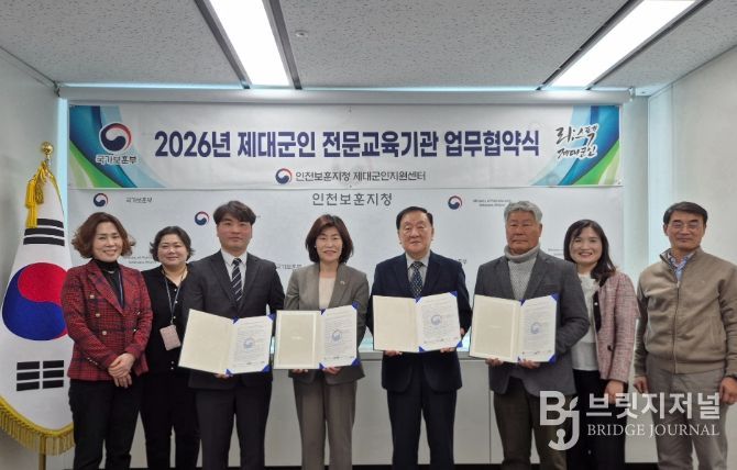 브릿지저널 김경미 기자 | 국가보훈부 인천보훈지청 제대군인지원센터는 2026년 3월 13일 정부인천지방합동청사에서 사)대한민국항공보안협회 민간경비교육원 등 3개 교육기관과 2026년도 제대군인 전문위탁교육 업무협약을 체결했다.