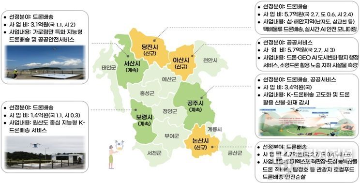 이와 함께 지난해에 이어 선정된 공주·보령·서산시는 드론 배송과 재난 감시 등 기존 실증사업을 고도화할 예정이다.