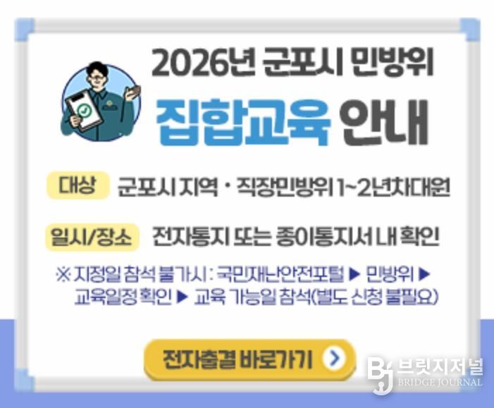 브릿지저널 김경미 기자 | 군포시는 민방위대원의 비상 시 대응 역량 강화를 위해 ‘2026년 민방위 기본교육’을 실시한다.