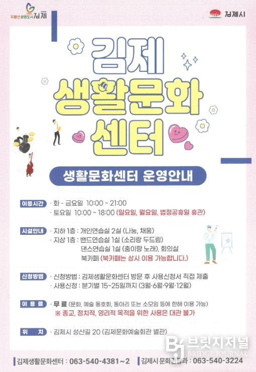 브릿지저널 윤나영 기자 | 김제시는 시민 문화활동 공간인 김제생활문화센터에서 2분기 시설 이용자를 모집한다고 밝혔다.