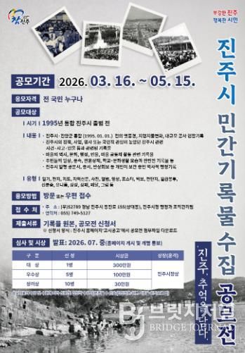 브릿지저널 김경미 기자 | 진주시는 사라져가는 지역의 옛 모습과 시민들의 소중한 생활사를 체계적인 기록 자산으로 보존하기 위해 ‘진주시 민간 기록물 수집 공모전: 진주, 추억을 담다’를 개최한다고 밝혔다.