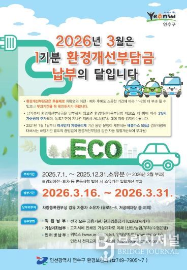 브릿지저널 김경미 기자 | 연수구는 노후 경유 자동차 5천5대에 올해 1기분 환경개선부담금 3억 6천만 원을 부과했다.