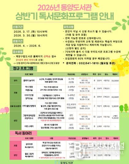 브릿지저널 김경미 기자 | (재)인천광역시계양구인재양성교육재단 동양도서관은 지역주민을 대상으로 2026년 상반기 독서문화프로그램 운영을 위한 수강생을 모집한다고 밝혔다.