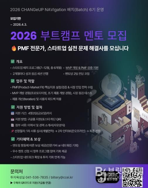 브릿지저널 정보영 기자 | (재)충남창조경제혁신센터가 기술 기반 유망 스타트업의 비즈니스 모델을 견고히 다질 2026 CHANGeUP NAVIgation 배치(Batch) 6기 부트캠프를 앞두고, 초기 스타트업의 시장 안착을 도울 전문가 멘토단을 모집한다.