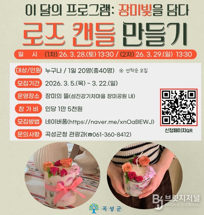 브릿지저널 김경미 기자 | 전남 곡성군은 ‘장밋빛을 담다’를 주제로 한 로즈캔들 만들기 체험 프로그램을 오는 3월 28일부터 29일까지 이틀간 운영한다고 밝혔다.