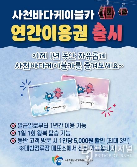 브릿지저널 김경미 기자 | 사천시시설관리공단(이사장 한재천)은 전국적인 재방문객 유도와 체류형 관광 수요 확대를 위해 3월 16일부터 ‘사천바다케이블카 연간이용권’ 제도를 새롭게 도입한다.