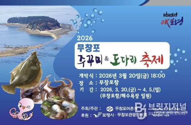 브릿지저널 정보영 기자 | 보령의 대표 수산물 축제인 ‘2026 무창포 주꾸미&도다리 축제’가 제23회를 맞아 3월 20일 개막식을 시작으로 4월 5일까지 17일간 무창포항·해수욕장 일원에서 펼쳐진다.