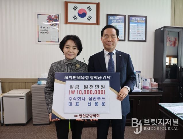 브릿지저널 김경미 기자 | 충북 진천군 (주)삼진푸드(대표 신용운)는 진천군청을 방문해 지역 인재 양성을 위한 장학금 1천만 원을 기탁했다고 17일 밝혔다.