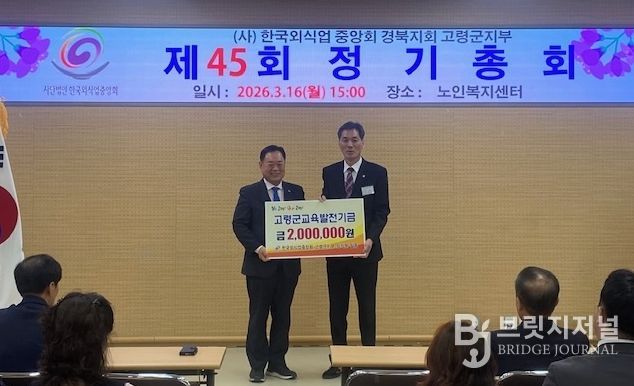 브릿지저널 정보영 기자 | 3월 16일 고령군 노인복지센터 강당에서 개최된 ‘사)한국외식업중앙회 경북지회 고령군지부 제45회 정기총회’에서 고령군지부 임직원은 지역의 교육 발전과 인재 양성을 위해 사용해 달라며 교육발전기금 200만원을 기탁했다.
