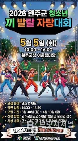 브릿지저널 윤나영 기자 | 완주군이 오는 5월 5일 제104회 어린이날에 아동과 청소년들이 주인공이 되어 숨겨진 재능과 에너지를 마음껏 발산할 수 있는 ‘2026 완주군 아동·청소년 끼 발랄 자랑대회’를 개최한다.