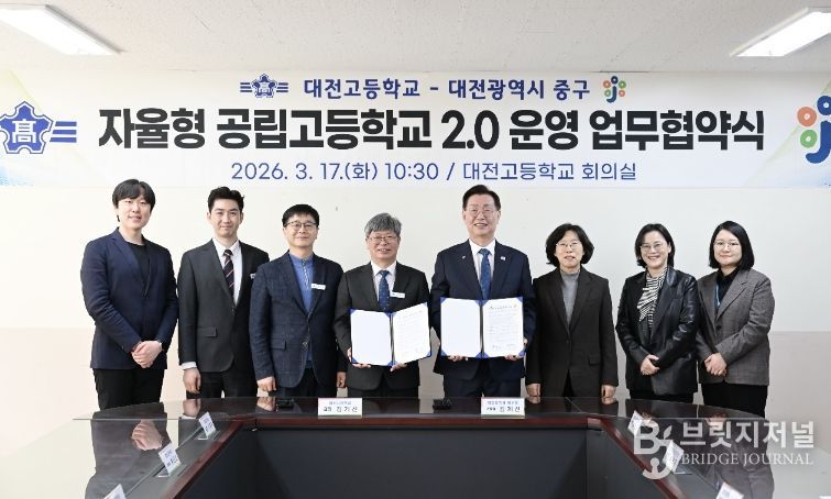 브릿지저널 정보영 기자 | 대전 중구는 17일 대전고등학교(교장 김기신)와 지역교육 기반 강화를 위한 상호교류 협력 협약을 체결하고, 지역과 학교가 유기적으로 소통하며 함께 성장하는 교육공동체 구축에 나섰다고 밝혔다.