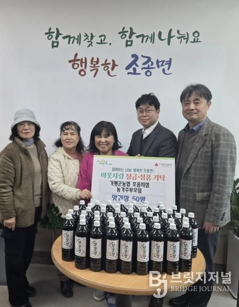 브릿지저널 김경미 기자 | 가평군농협 조종지점 농가주부모임은 16일 조종면 행정복지센터를 방문해 취약계층을 위한 맛간장 50병을 전달하며 따뜻한 나눔을 실천했다.