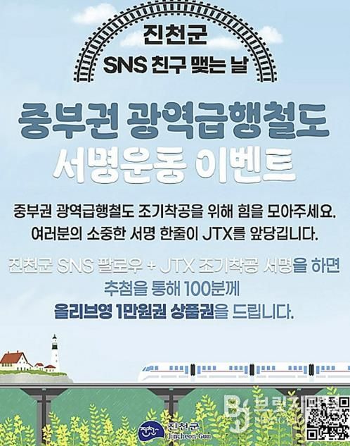 브릿지저널 김경미 기자 | 충북 진천군이 ‘중부권 광역급행철도(JTX)’ 조기 착공을 위한 군민과 국민의 관심을 모으기 위해 오는 3월 29일까지 SNS 서명운동 참여 이벤트를 진행한다.