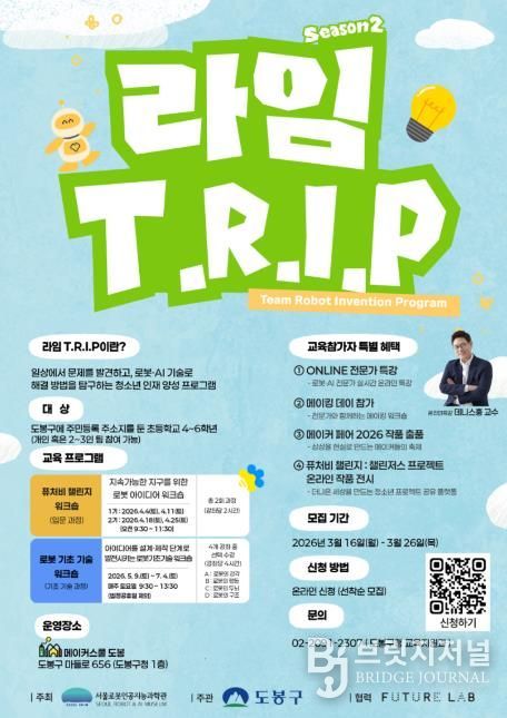 브릿지저널 김경미 기자 | 서울 도봉구가 서울로봇인공지능과학관(RAIM)이 주최하는 '2026년 RAIM T.R.I.P(동행 로봇 발명프로그램)' 참여 자치구로 선정됐다고 밝혔다.