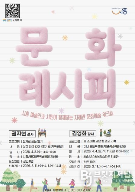 브릿지저널 김경미 기자 | 시흥시가 지역 예술인과 시민이 함께 참여하는 문화예술 프로그램 ‘2026 문화레시피’를 4월부터 11월까지 시흥ABC행복학습타운 지혜관에서 운영한다.