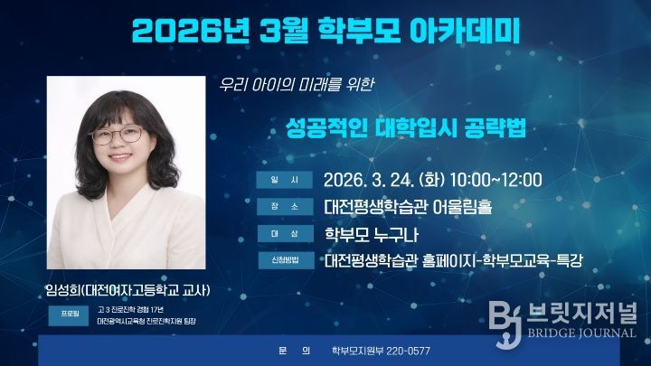브릿지저널 정보영 기자 | 대전시교육청 대전평생학습관은 3월 24일 관내 학부모를 대상으로 대전평생학습관 어울림홀에서 올해 첫 학부모 아카데미 특강을 운영한다고 밝혔다.