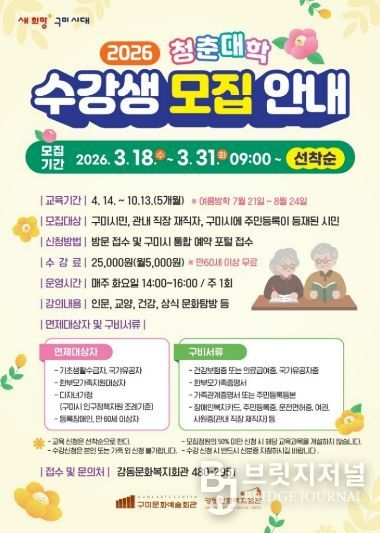 브릿지저널 정보영 기자 | 구미시강동문화복지회관은 3월 18일부터 3월 31일까지 ‘청춘대학’ 수강생을 모집한다.