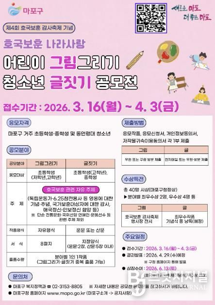 브릿지저널 김경미 기자 | 마포구는 제4회 호국보훈 감사축제를 맞아 어린이와 청소년이 국가보훈대상자의 희생과 헌신을 기억하고 나라사랑의 의미를 되새길 수 있도록 ‘호국보훈·나라사랑 어린이 그림그리기·청소년 글짓기 공모전’을 개최한다.