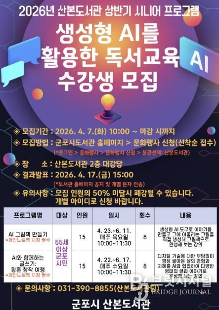 브릿지저널 김경미 기자 | 군포시 산본도서관은 디지털 소외 세대인 시니어가 생성형 AI를 활용하여 능동적인 창작 주체로 거듭날 수 있도록 돕는 '생성형 AI를 활용한 시니어 독서교육' 프로그램을 운영한다. 이번 프로그램은 시니어가 생성형 AI를 활용한 창작 활동에 참여할 수 있도록 지원하여 삶의 질을 향상하고자 기획됐다.