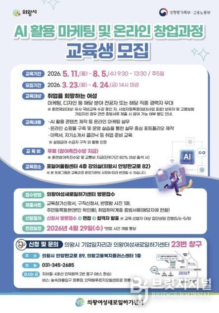 브릿지저널 김경미 기자 | 의왕여성새로일하기센터는 마케팅 사무원 분야 취업과 온라인 창업을 희망하는 여성 시민을 대상으로 ‘인공지능 활용 마케팅 및 온라인 창업과정’ 교육생을 모집한다.