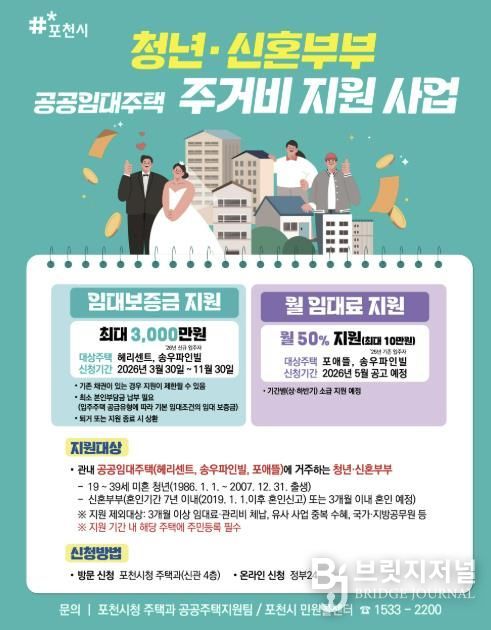 브릿지저널 김경미 기자 | 포천시는 관내 공공임대주택에 거주하는 청년 및 신혼부부를 대상으로 ‘2026년 청년·신혼부부 공공임대주택 주거비 지원사업’을 시행한다.