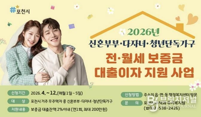 브릿지저널 김경미 기자 | 포천시는 ‘2026년 신혼부부·다자녀·청년가구 전월세 보증금 대출이자 지원사업’을 추진한다.