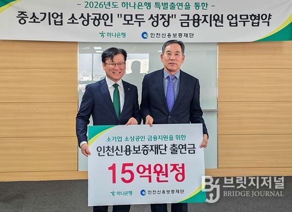 브릿지저널 김경미 기자 | 인천신용보증재단은 하나은행과 함께 인천 지역 중소기업과 소상공인의 안정적인 자금 조달을 지원하기 위한 '중소기업·소상공인 “모두 성장” 금융지원 업무협약'을 체결했다고 밝혔다.