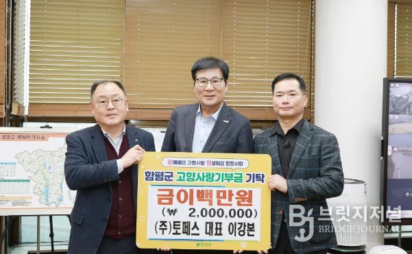 브릿지저널 김경미 기자 | ㈜토페스 이강본 대표가 고향사랑기부금 200만원을 전남 함평군에 기탁하며 지역사회에 온정을 나누고 있다.