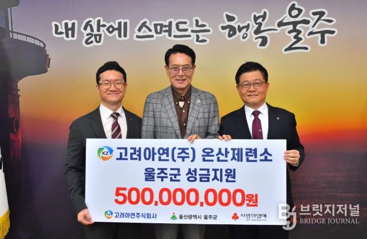 브릿지저널 윤나영 기자 | 고려아연(주)이 18일 울주군 지역사회의 어려운 이웃을 돕기 위해 이웃사랑 성금 5억원을 전달했다.