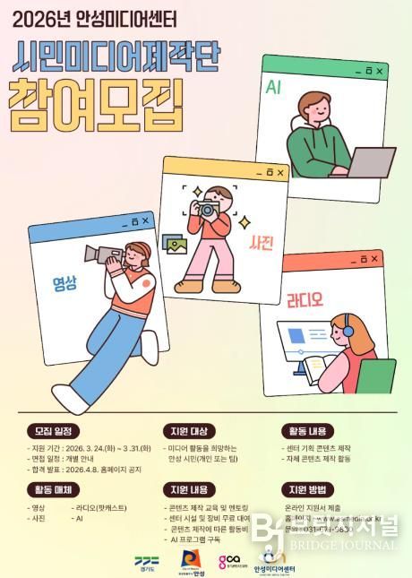 브릿지저널 김경미 기자 | 안성시 미디어센터는 시민과 지역 모임(단체)의 미디어 콘텐츠 제작 활동을 지원하는 ‘시민미디어제작단’ 사업 참여자를 오는 3월 31일까지 모집한다.