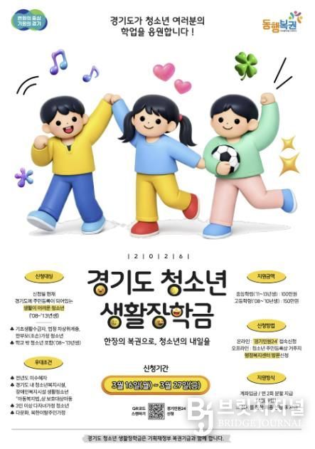 브릿지저널 김경미 기자 | 가평군은 복권기금을 재원으로 하는 ‘2026년 경기도 청소년 생활장학금’ 신청을 이달 16일부터 27일까지 접수한다.