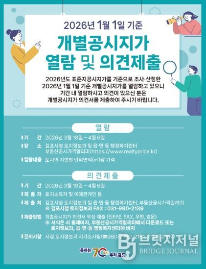 브릿지저널 김경미 기자 | 김포시는 2026년 1월 1일 기준 개별공시지가(안)에 대하여 오는 3월 18일부터 4월 6일까지 열람을 실시하고 토지소유자 및 이해관계인의 의견을 접수한다고 밝혔다.