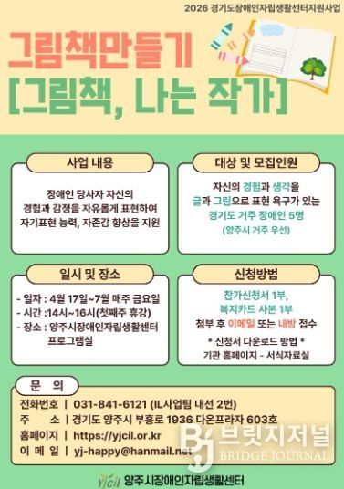 브릿지저널 김경미 기자 | 양주시장애인자립생활센터에서는 장애인의 문화·예술 참여 기회를 확대하고 자기 표현의 장을 마련하기 위해 그림책 만들기[그림책, 나는 작가] 참가자를 모집한다.