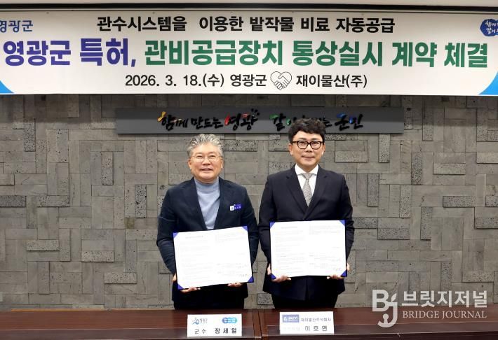 브릿지저널 김경미 기자 | 영광군은 지난 18일 전북 군산시에 위치한 재이물산(주)과 ‘관비공급장치’ 특허에 대한 통상실시권 계약을 체결했다고 밝혔다.
