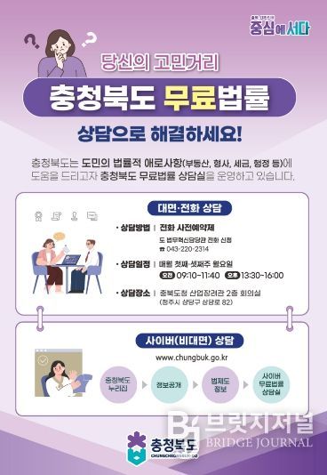 브릿지저널 김경미 기자 | 충북도가 3월 19일 보은군을 시작으로, 올해 상반기 도내 3개 시군 현장에서 도민의 법적 애로사항을 듣는 ‘찾아가는 무료법률상담실’을 운영한다.