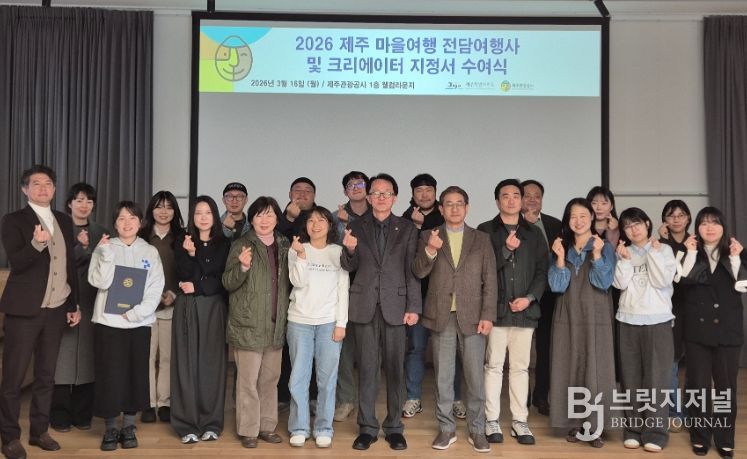 브릿지저널 정보영 기자 | 제주특별자치도와 제주관광공사(사장 고승철)은 3월 16일 월요일, 제주 웰컴센터에서 ‘2026 제주 마을 여행 전담 여행사 및 크리에이터’ 지정서 수여식을 개최하고 총 11개소를 공식 지정했다고 17일 밝혔다.