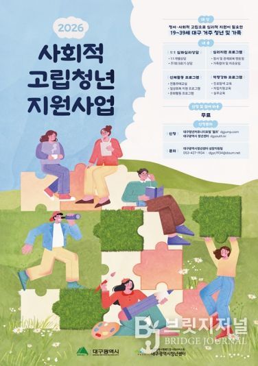 브릿지저널 김진석 기자 | 대구광역시는 심리적·정서적 어려움으로 사회와 단절된 고립 청년들이 건강한 일상을 되찾고 성공적으로 사회에 복귀할 수 있도록 ‘2026년 사회적 고립청년 지원사업’을 본격 추진한다.